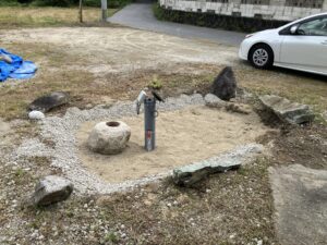 透水性が抜群のトース土を材料として使用、作成した「雨庭」のデータを取ります。どんな数値が出るのか楽しみです。熊本県立大学共創の流域治水研究室と全国トース技術研究組合の共同検証です。