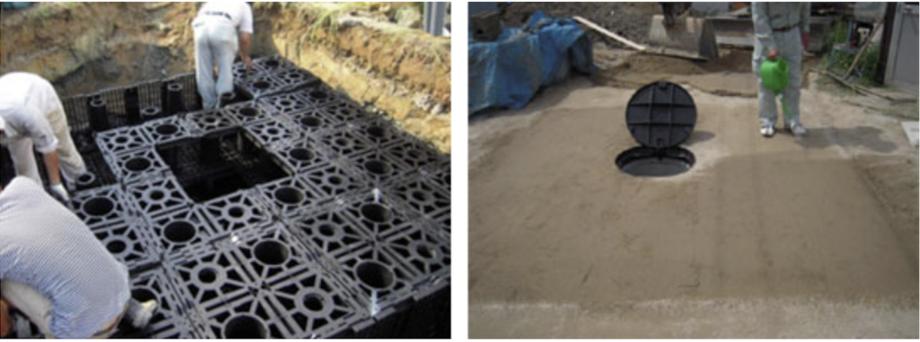 ATTAC工法で施工したグラウンドや広場などの下に雨水の貯留槽を埋設し、降雨を浸透貯留させる工法。浸透した雨水であるため、濁りが少なく非常時など、トイレの水などに利用しやすい。コンクリート製の貯留槽なので、地下水位が高い場所でも設置が可能であるため、場所の選定が容易である。