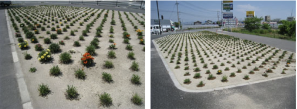 従来の土系の防草対策工法は表面は土そのものが見えており、景観や環境的に配慮はされているが、優れているとは言い難いです。