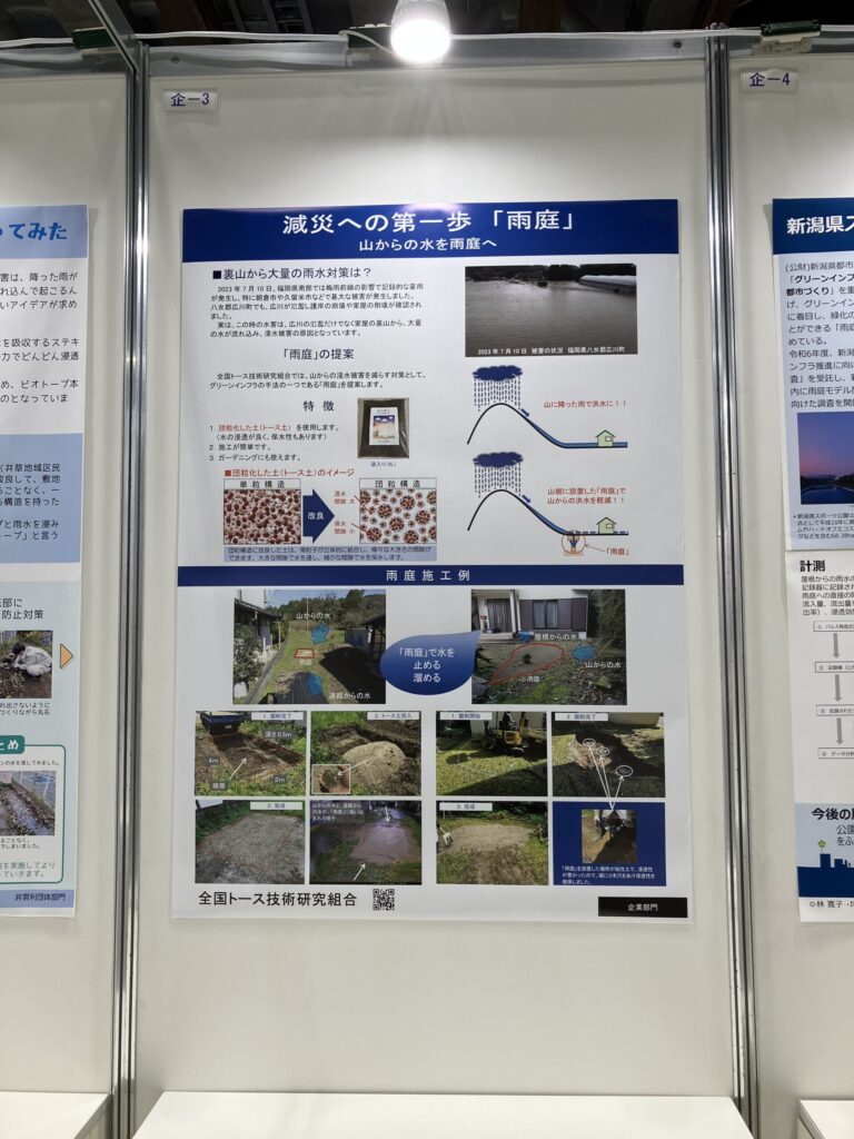 東京ビッグサイトでは、当日3日間グリーンインフラ・ネットワーク・ジャパン主催の「雨庭ポスター展示全国大会」が催され当組合もポスター作製して参加いたしました。「雨庭」が「トース土」が、雨水が浸透していくように、全国に浸透していきますように! 2025年2月3日 最終更新日時 : 2026年2月20日 rirydesign \ 最新情報をチェック / FacebookXBlueskyHatenaCopy