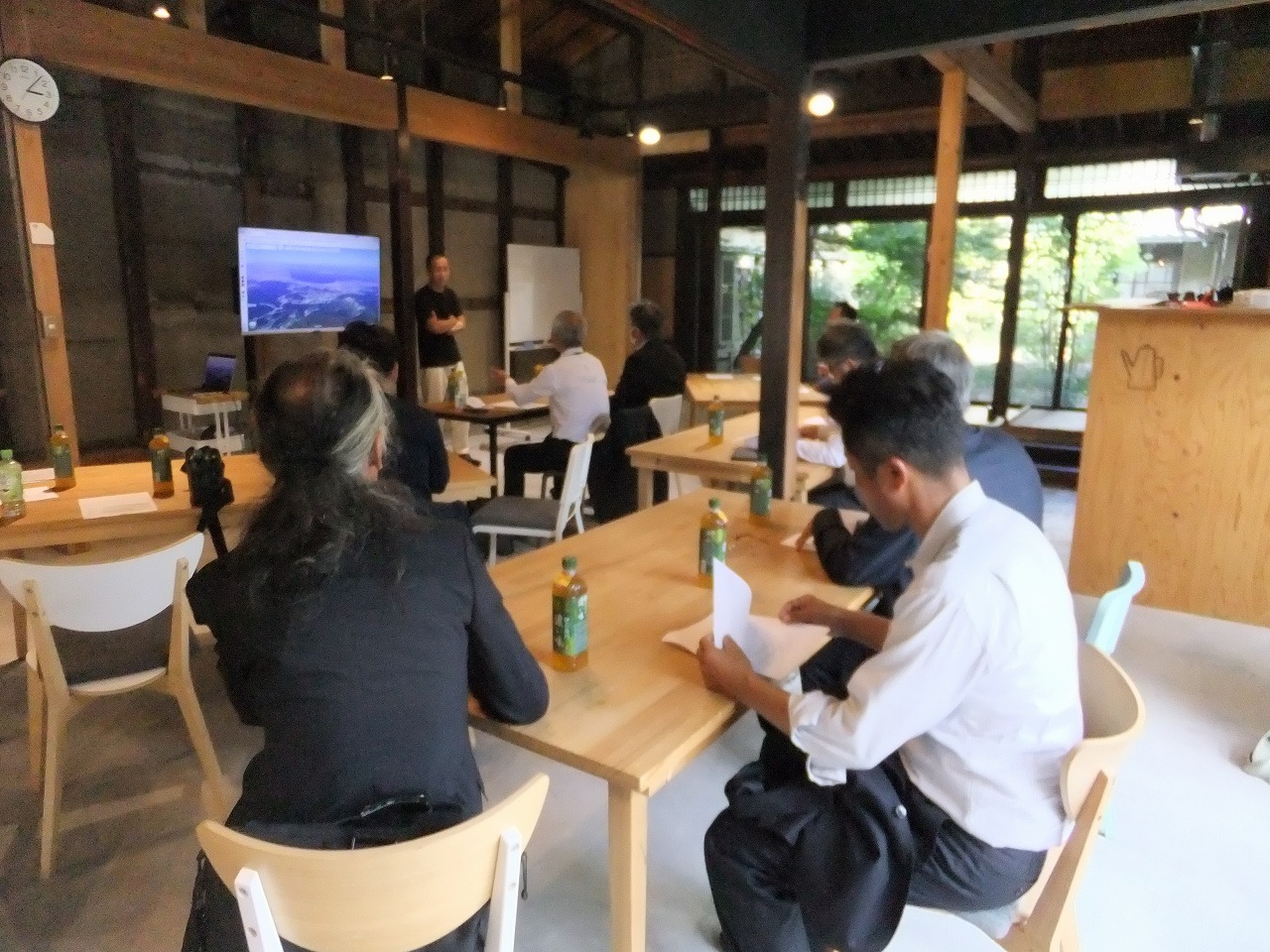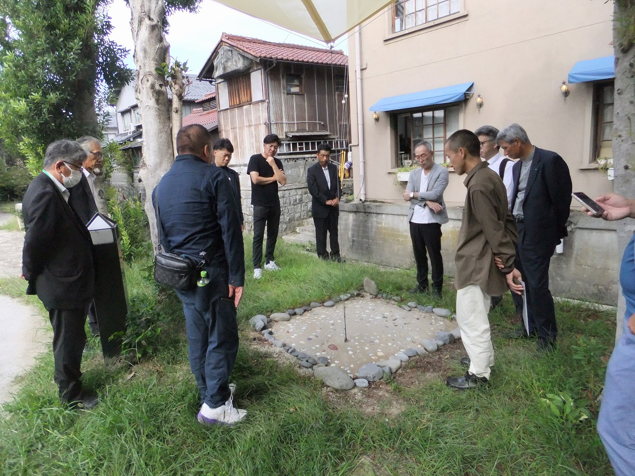 移動して、滋賀県長浜市に来ました。黒しっくいの建物が建ち並ぶ歴史的な景観と、食を楽しめる「黒壁スクエア」に集合しました。曳山博物館の川の畔の庭に、トース土で作られた「雨庭」と、その上に降った雨を集めて「雨庭」に落とすテント風の屋根。地元県立大学の学生さんが、考案されました。米川よろず会議という、この街と川を愛する人たちが、地域のために頑張っている会の、代表の竹村光雄氏に、いろいろなお話しをしていただき、街も案内していただきました。竹村先生ありがとうございました。